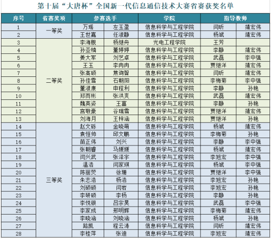 近日,第十届“大唐杯”全国大学生新一代信息通信技术大赛省级获奖名单揭晓。我校学子在本次大赛中取得优异成绩,共获得本科组奖励28项,其中一等奖2项(入围国赛)、二等奖11项、三等奖15项。