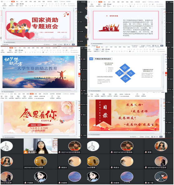 12月8日至13日,马克思主义学院各班级通过召开线上主题班会等形式开展了国家资助政策宣讲暨感恩励志教育活动,加大国家资助政策宣传力度,加强家庭经济困难学生资助政策宣传,普及家庭经济困难学生资助知识,加强对学生的励志教育以及感恩教育,助力学生成长成才。
