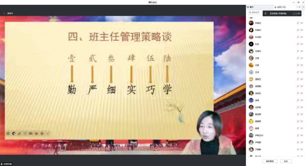 主讲人之一高兆荣老师以“它山之石可以攻玉”为题,结合十二年的班主任工作经历,围绕“勤、严、细、实、巧、学”的班主任管理策略,与参会师生分享了自己的班主任经验。同时还分享了“踢球法”、“体贴法”等管理班级的方法,体现出静心教书、潜心育人的理念。