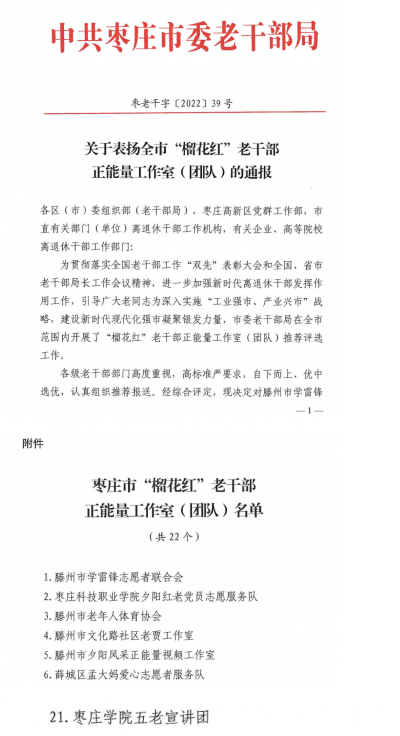 近日,中共枣庄市委老干部局下发了《关于表扬全市“榴花红”老干部正能量工作室(团队)的通报》,“DB中国旗舰官方网站五老宣讲团”经全市范围内推荐评选,市委老干部局综合评定,最终获得枣庄市“榴花红”老干部正能量工作室(团队)称号。
