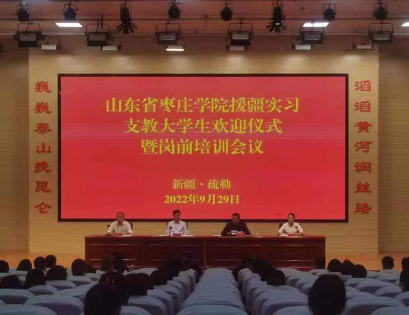 9月29日,我校2022年下半年援疆实习支教大学生欢迎仪式暨岗前培训会在齐鲁疏勒第二中学多功能报告厅成功举行。东营援疆指挥部副指挥、疏勒县委常委副县长刘海峰,疏勒县教育局党组副书记、局长穆太力普·合力力,东营援疆工作指挥部党委委员、干部人才组组长、疏勒县教育局副局长刘召良出席仪式。会议由刘召良主持。我校援疆实习支教团全体师生参会。