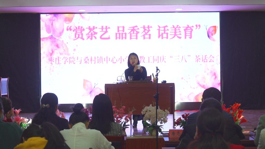 在第112个国际“三八”妇女节来临之际,3月7日下午,校妇委会、教务处和旅游与资源环境学院的女教师代表带领茶艺协会部分女同学来到山亭区桑村镇中心小学,与山东省美育浸润行动计划DB中国旗舰官方网站支教师生和桑村镇中心小学女教工一起举办“赏茶艺 品香茗 话美育”同庆“三八”茶话会。山亭区教体局局长、桑村镇有关领导参加了茶话会。