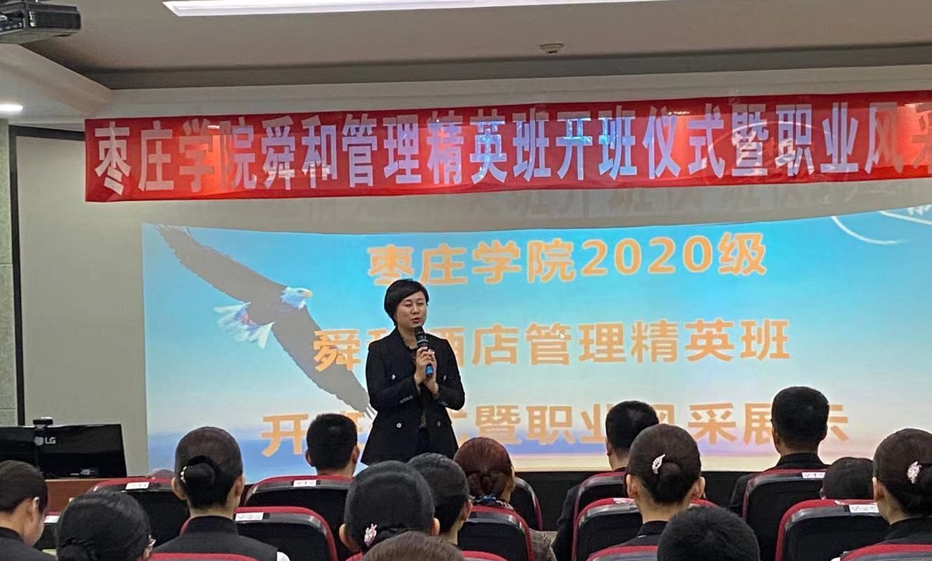 仪式上,山东舜和酒店集团副总裁白璐对学院的支持表示感谢,舜和管理精英班将助力旅游与资源环境学院培养更多应用型人才。院长助理张大文对山东舜和酒店集团白璐副总裁一行表示热烈欢迎,希望舜和管理精英班的同学们珍惜学习机会,尽快提升综合能力,以适应现代服务业发展的需要。随后2020级舜和酒店管理精英班举行了授旗仪式、文化展板以及职业风采展示。