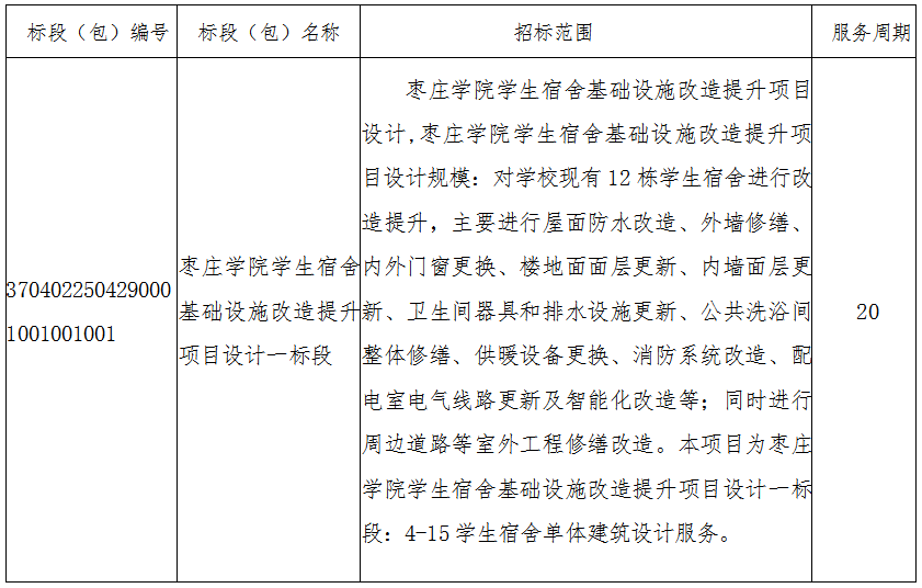 项目名称:DB中国旗舰官方网站学生宿舍基础设施改造提升项目设计已经由枣庄市·市中区备案,招标人为DB中国旗舰官方网站,工程所需资金来源为自筹,项目已具备招标条件,现对该项目的DB中国旗舰官方网站学生宿舍基础设施改造提升项目设计进行公开招标。本次招标对投标报名人的资格审查,采用资格后审方法选择合适的投标申请人参加投标。