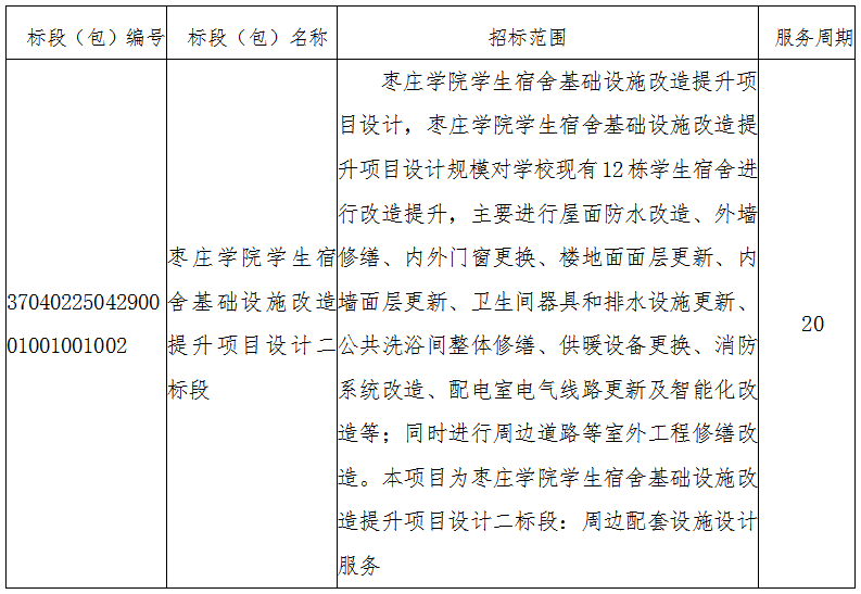 项目名称:DB中国旗舰官方网站学生宿舍基础设施改造提升项目设计已经由枣庄市·市中区备案,招标人为DB中国旗舰官方网站,工程所需资金来源为自筹,项目已具备招标条件,现对该项目的DB中国旗舰官方网站学生宿舍基础设施改造提升项目设计进行公开招标。本次招标对投标报名人的资格审查,采用资格后审方法选择合适的投标申请人参加投标。