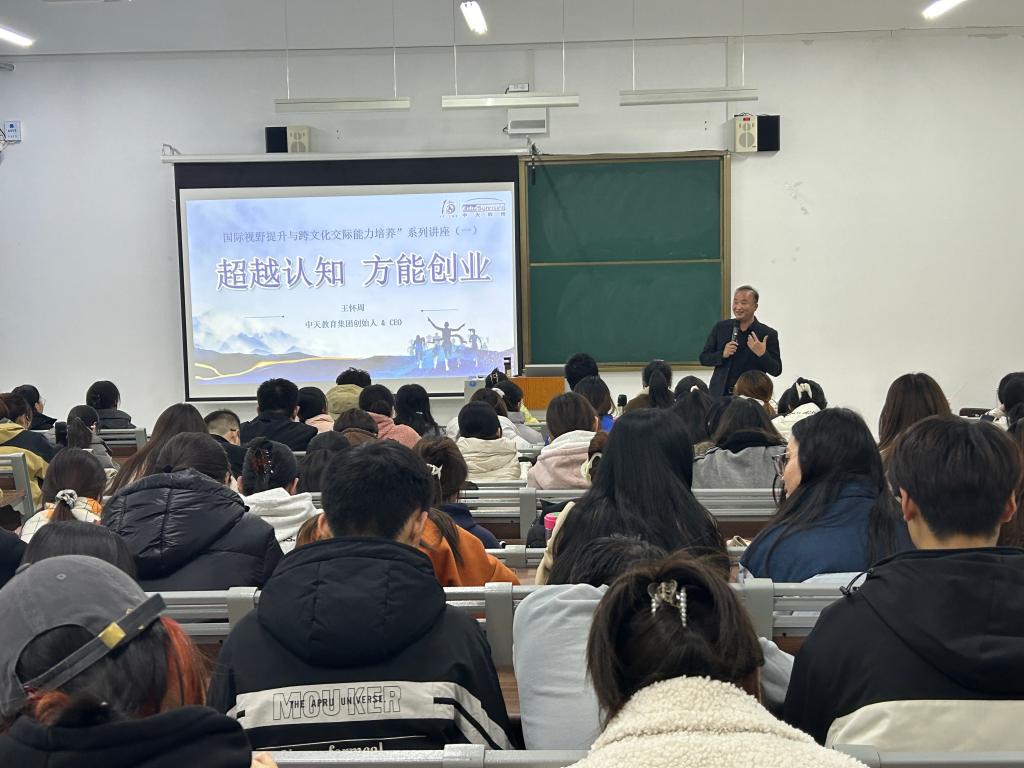 12月4日下午,我校“国际视野提升与跨文化交际能力培养”系列讲座第一场在增信楼121举行,活动邀请外国语学院1997级校友,北京中天教育总裁,澳大利亚国际教育文化交流协会执行会长王怀周作报告。讲座由国际交流处处长褚夫敏主持,150余名学生代表聆听了此次讲座。