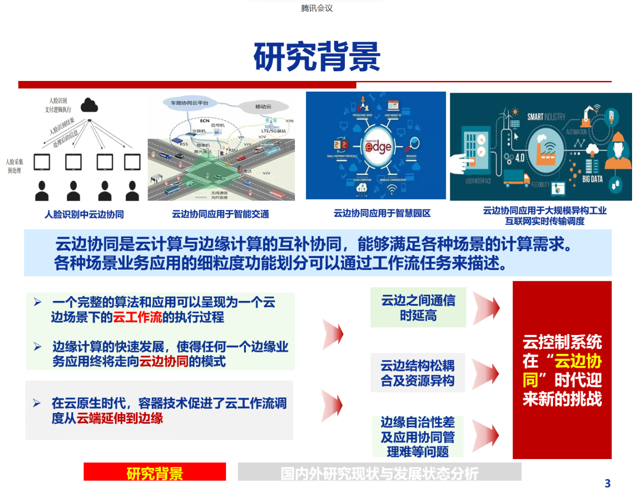 单老师介绍了云边协同相关研究背景、云工作流作为云控制系统实践化应用的主要途径在云边场景下的容器化调度遭遇的诸多挑战。单老师指出,在研究云边场景下云控制系统典型算法的工作流抽象描述,云工作流高效调度算法,容器化工作流调度机制以及云边协同模式下的任务调度优化问题。单老师最后强调,研究的最终目标是形成一整套能够支撑云控制系统云边场景的实践化应用方案、部署系统、关键算法及技术。