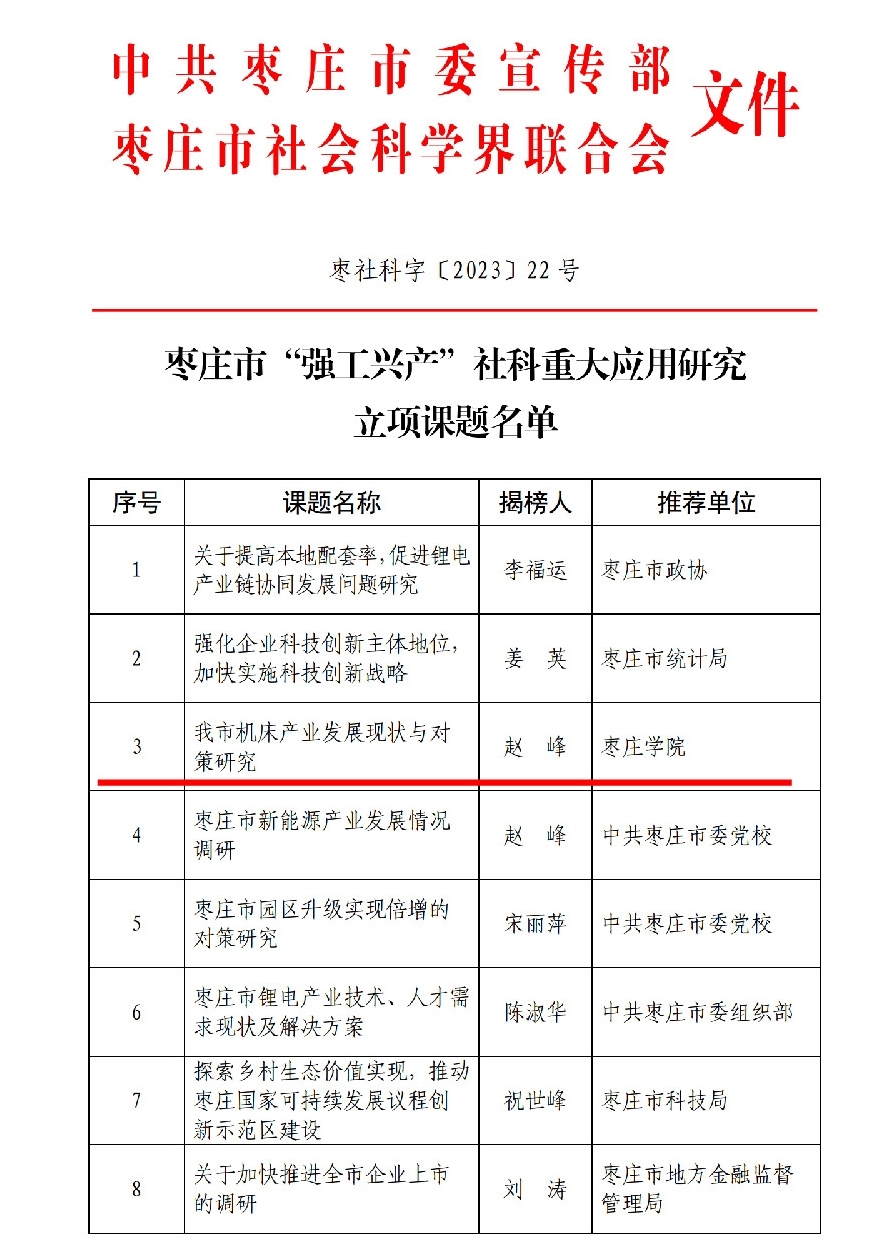 近日,中共枣庄市委宣传部和枣庄市社会科学界联合会公布了枣庄市“强工兴产”社科重大应用研究课题立项名单,我校教师赵峰教授揭榜的“我市机床产业发展现状与对策研究”项目成功获批。