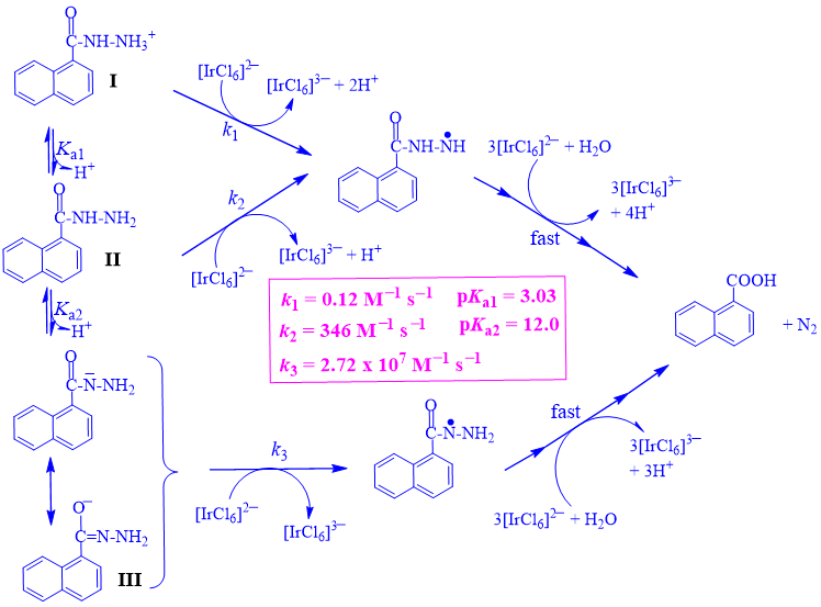 肼类化合物是一大类药物中间体,有10多种处方药物,同时也是一类良好的抗氧化剂,而萘酰肼是其中之一的代表型化合物。在本研究工作中,同学们使用现代分析仪器技术对萘酰肼在水溶液的分布平衡及其各个形态的抗氧化活性进行详实的表征。依据大量实验数据,提出了萘酰肼抗单电子氧化的反应机理,并揭示出萘酰肼不同形态存在着巨大的活性差异(见下图)。