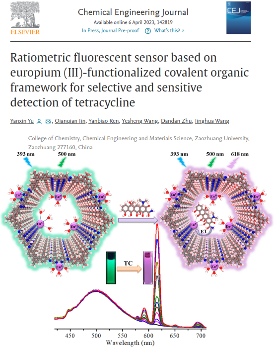 近日,化学化工与材料科学学院于延新博士及团队在抗生素检测方面的研究取得新进展,相关工作发表在国际著名期刊《Chemical Engineering Journal》(中科院1区,TOP期刊,影响因子16.744)上,论文题目为:Ratiometric fluorescent sensor based on europium (III)-functionalized covalent organic framework for selective and sensitive detection of tetracycline。