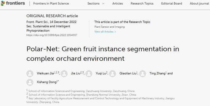 近日,信息科学与工程学院可视化与智能交叉科研创新团队设计了一种适于复杂果园环境下绿色目标果实实例分割的优化PolarMask算法,有效提高同色系目标的分割精度。研究成果以“Polar-Net: Green fruit instance segmentation in complex orchard environment”为题发表在Frontiers in Plant Science。
