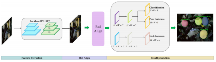 为解决同色系目标的分割难题,降低同色系目标的漏识或误识率,以期提高同色系目标的识别精度,课题组提出优化的PolarMask模型,将实例分割问题转化实例中心分类和回归预测实例轮廓两部分。借助DenseNet主干网络进行特征提取,构造FPN+RPN架构对于不同尺度特征的提取以及判别。头部网络包含两个分支:分类分支,由类别分类和极点中心两部分构成,实现对于实例的分类,并生成极点中心;回归分支,实现对于极坐标下建模并生成实例轮廓。实验结果表明,在构造的绿色柿子数据集上,新算法的平均检测精度为69.8%,平均分割精度为65.1%。该成果以期为其他绿色目标果实的检测、分割提供理论借鉴。