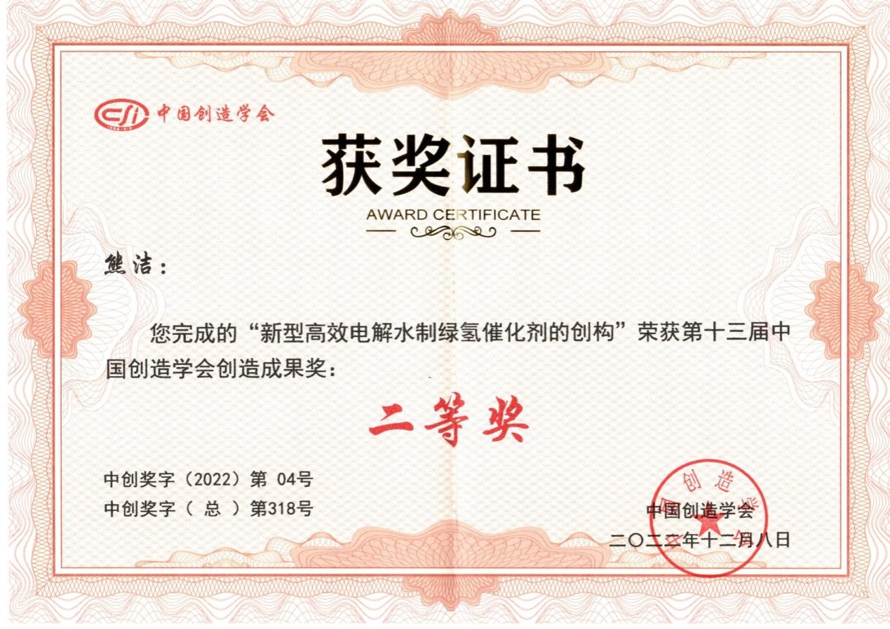 近日,中国创造学会(国家一级学会)在上海国际设计中心组织专家对第十三届“中国创造学会创造成果奖”进行现场评审,共评审出一等奖3项、二等奖5项、三等奖10项。我校化学化工与材料科学学院熊洁博士领衔的成果“新型高效电解水制绿氢催化剂的创构”荣获第十三届中国创造学会创造成果二等奖。