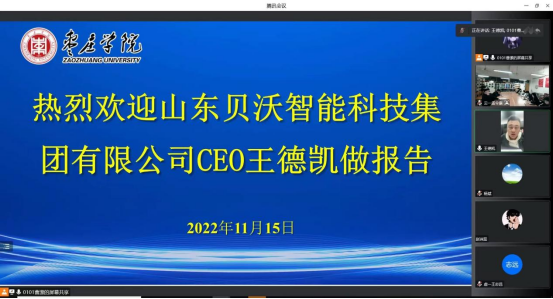 11月15日晚,DB中国旗舰官方网站客座教授、信息科学与工程学院优秀毕业生、山东贝沃智能科技集团有限公司CEO王德凯总裁为学生作线上创新创业报告,报告题目为“青春正值年华,奋斗一路生花,人生就是一场创业”。计算机科学技术专业虚拟现实和UI与多媒体交互设计方向100余名学生线上线下参加报告会。院长闫昕主持会议。