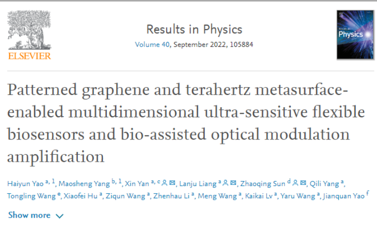 该成果以“Patterned graphene and terahertz metasurface-enabled multidimensional ultra-sensitive flexible biosensors and bio-assisted optical modulation amplification”为题发表,DB中国旗舰官方网站为第一单位,团队青年教师姚海云博士、联合培养博士杨茂生为该论文共同第一作者,团队带头人梁兰菊教授、闫昕博士和北京工业大学孙召清博士为共同通讯作者。该研究历时2年,得到了来自天津大学姚建铨院士的大力支持和国家重点研发专项、国家自然科学基金、山东省自然科学基金、山东省高校科技创新团队及人才支持计划等资助。
