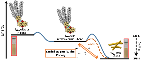 王后臣博士和石铁生教授及其化学生物学创新团队,在有机小分子的超分子组装研究中发现一种新型的超分子聚合机理,其相关工作在《Organic Chemistry Frontiers》(中科院SCI期刊分区1区)上正式发表。论文题目为:A novel pathway and seeded polymerizations of aggregates at the thermodynamic state for an amido-anthraquinone compound。本文设计并合成了具有三(十二烷氧基)苯甲酰胺基团的蒽醌分子1。 紫外-可见吸收光谱和核磁共振谱证实:在高温下,该分子以无氢键的单体构象存在;在较低的温度下,通过分子内氢键的形成,单体很容易转变并呈现为另一种具有分子内氢键的单体构象;继续降温时,形成的热力学稳定性超分子聚集体。在超分子聚合途径中,分子内氢键得以保留,没有进一步转化为更为稳定的分子间氢键。毫无疑问,该工作发现了一种新型的超分子组装途径,这一新的分子组装途径可能在多肽药物和蛋白的研究中得到拓展及应用。