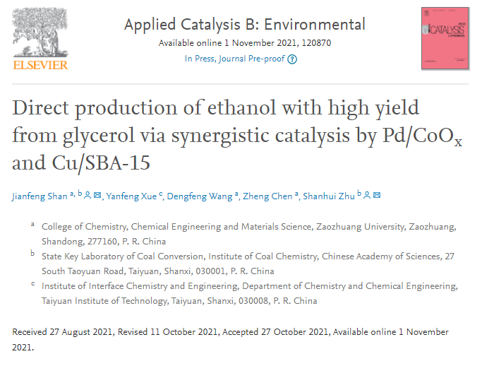 近日,化学化工与材料科学学院工业催化团队在甘油催化转化方面取得最新进展,相关工作发表在国际著名期刊《Applied Catalysis B: Environmental》(中科院一区,TOP期刊,影响因子19.503)上,论文题目为《Direct production of ethanol with high yield from glycerol via synergistic catalysis by Pd/CoOx and Cu/SBA-15》,DB中国旗舰官方网站为第一单位,单建锋博士为论文第一作者及通讯作者。