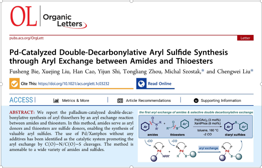 该项研究首次报道了钯催化的酰胺和硫酯之间的双脱羰芳基交换反应,从而实现了有价值的芳基硫化物的合成。该方法以Pd(OAc)2/Xantphos为催化体系,酰胺为芳基供体,硫酯为硫化物供体,在不需要外加碱或其他添加剂的条件下,实现芳基硫醚的高选择性、高产率合成。该方法适用于多种酰胺和硫化物,并且可应用于药物分子的后期修饰。
