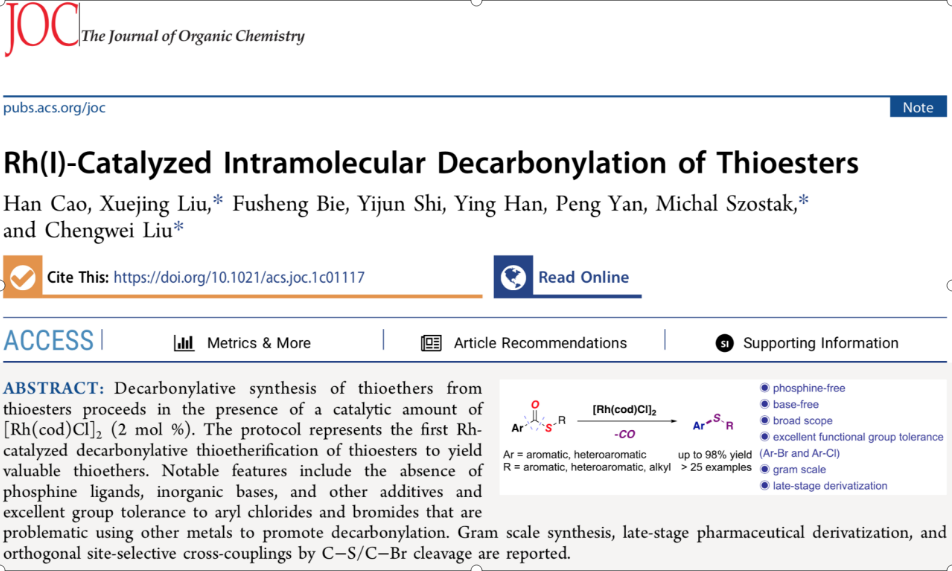 近日,鲁南煤化工工程技术研究院刘雪静科研团队在铑催化的硫酯的分子内脱羰偶联反应方面取得最新进展,相关工作发表在国际著名期刊《The Journal of Organic Chemistry》上,论文题目为《Rh(I)-Catalyzed Intramolecular Decarbonylation of Thioesters》,曹晗老师为第一作者,刘雪静教授为通讯作者,DB中国旗舰官方网站为第一单位。