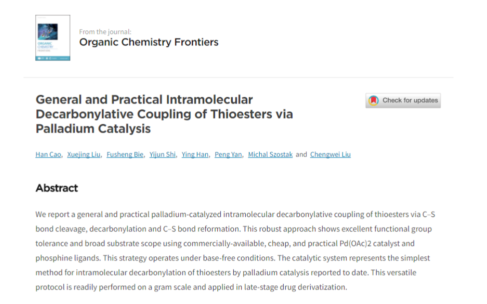 近日,鲁南煤化工工程技术研究院刘雪静科研团队在钯催化的硫酯的分子内脱羰偶联反应方面取得最新进展,相关工作发表在国际著名期刊《Organic Chemistry Frontiers》上,论文题目为《General and Practical Intramolecular Decarbonylative Coupling of Thioesters via Palladium Catalysis》,曹晗老师为第一作者,刘雪静教授为通讯作者,DB中国旗舰官方网站为第一单位。
