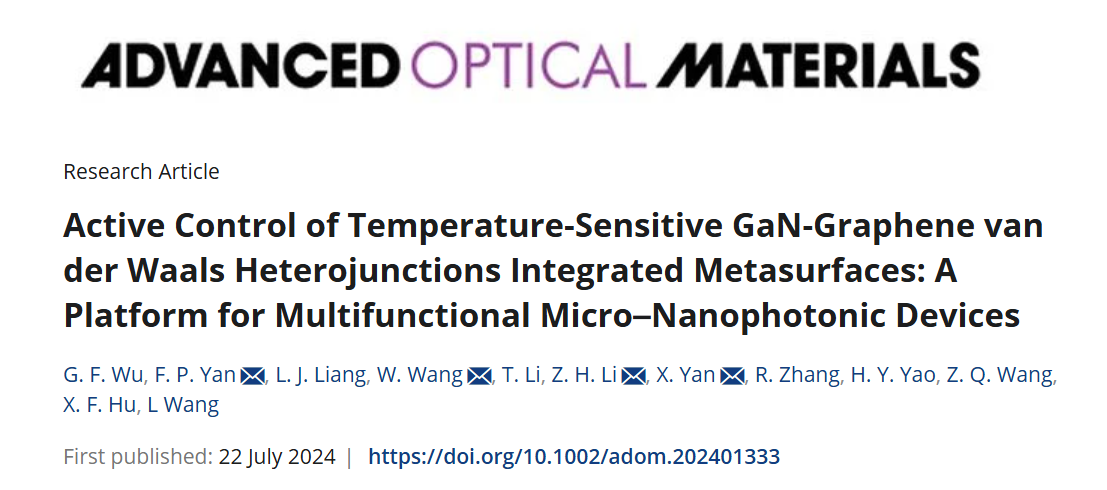 近日,我校光电工程学院山东省太赫兹科学技术及应用创新团队梁兰菊教授课题组联合培养研究生武桂芳设计了一种基于氮化镓/石墨烯范德瓦尔异质结与超表面集成的多功能温敏纳米器件。研究成果以“Active control of temperature-sensitive GaN-graphene van der Waals heterojunctions integrated metasurfaces: a platform for multifunctional micro–nanophotonic devices”为题发表在Advanced Optical Materials。