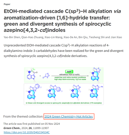 “2024 Green Chemistry Hot Articles”热点论文集链接:https://pubs.rsc.org/en/journals/articlecollectionlanding?sercode=gc&themeid=c167f2c6-a069-47ff-a09d-95f8016e0dca